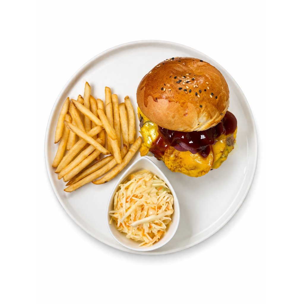 hovězí maso Black Angus, čedar, anglická slanina, nakládaná cibule, ledový salát, rajče, slaninová omáčka